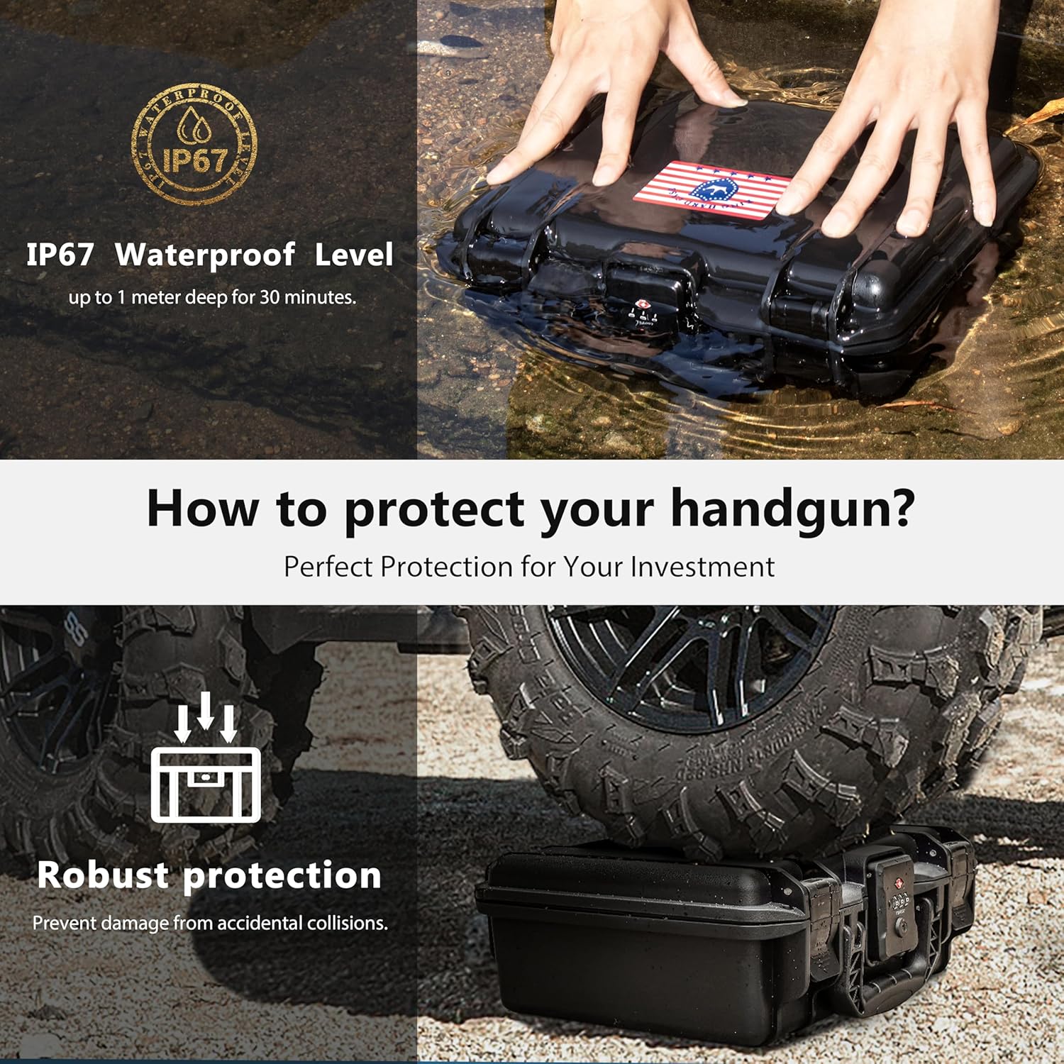 - Waterproof and hard handgun case: This IP67-rated pistol case hard shell has a built-in waterproof seal that provides waterproof, dust and shock protection to keep your gun safe in harsh environment. Suitable for hiking, travelling, shooting ranges, camping, off-road adventures and weather conditions such as rain, snow