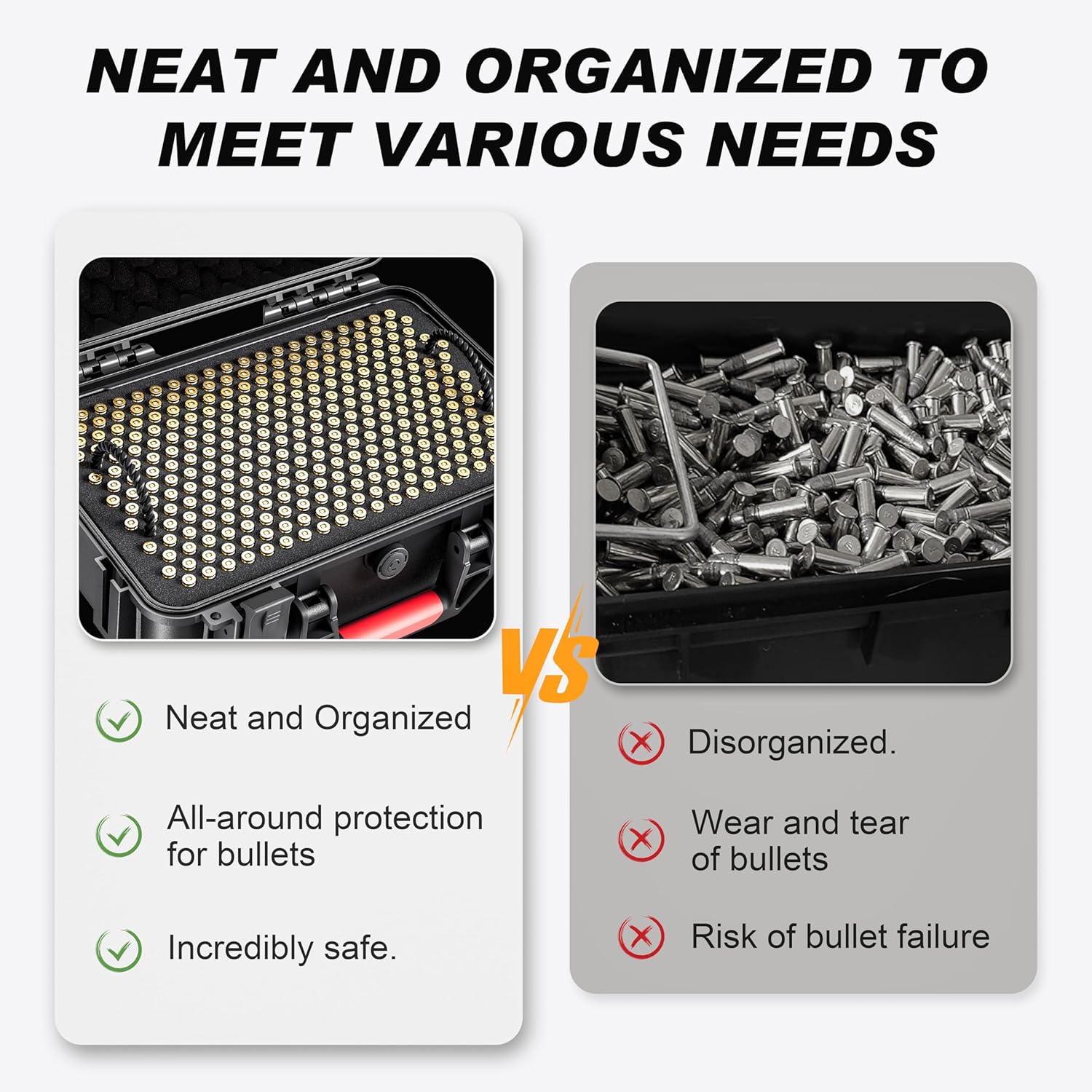 - Store 600 rounds: The new 3-tier design ammo case easily holds 600-700 rounds. It features an innovative dual tray with two handles per tier; the top tier can be raised to double the capacity, while the final tier provides flexible storage for bullets or other small accessories. Dividers effectively separate bullets, offering extra protection and organization for safe storage. The 9 mm ammo case also comes with a desiccant to keep the bullets dry